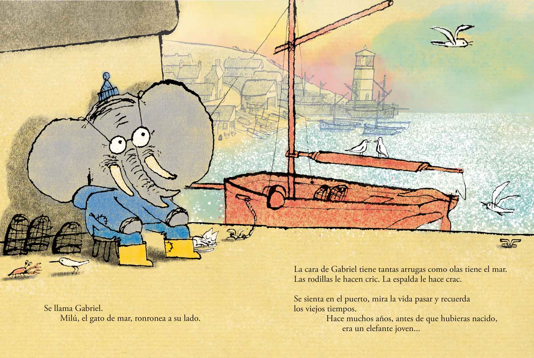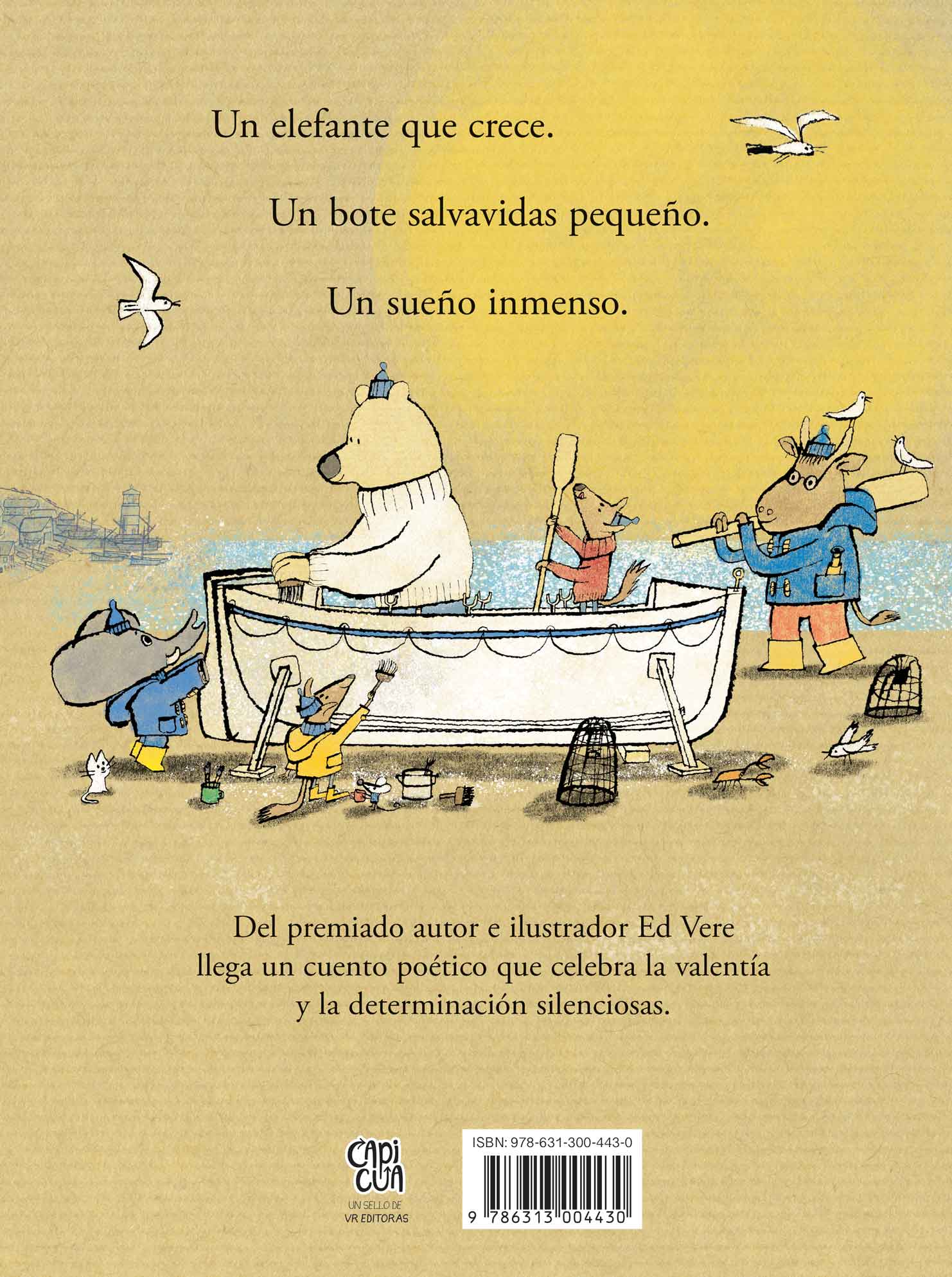Gabriel, el elefante, sueña con formar parte de la tripulación del bote salvavidas de su ciudad costera, pero es demasiado joven y demasiado pequeño. Pero poco a poco Gabriel se hace más fuerte y más grande y ahora es demasiado. . . ¡ GRANDE! Decepcionado pero muy decidido, Gabriel elabora un plan. Martilla y corta, sierra y lija, y construye su propio barco. Una noche, se desata una gran tormenta, y Gabriel sale al rescate en el barco que ha construido a su medida. Lucha solo con sus remos contra las olas para salvar a la tripulación en peligro. Lo logra y en el puerto lo reciben como al héroe que es. ¡ Todos quieren pertenecer a la tripulación de Gabriel! Y así será, porque ahora van a construir un barco donde quepan ¡ todos!