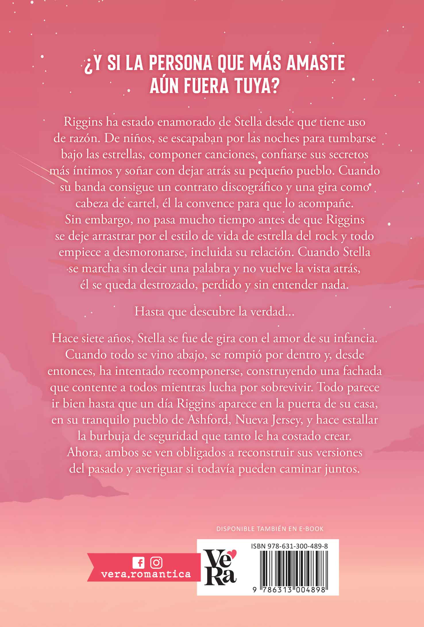¿Y SI LA PERSONA QUE MÁS AMASTE AÚN FUERA TUYA? Riggins ha estado enamorado de Stella desde que tiene uso de razón. De niños, se escapaban por las noche para tumbarse bajo las estrellas, componer canciones, confiarse sus secretos más íntimos y soñar con dejar atrás su pequeño pueblo. Cuando su banda consigue un contrato discográfico y una gira como cabeza de cartel, él la convence para que lo acompañe. Sin embargo, no pasa mucho tiempo antes de que Riggins se deje arrastrar por el estilo de vida de estrella del rock y todo empiece a desmoronarse, incluida su relación. Cuando Stella se marcha sin decir una palabra y no vuelve la vista atrás, él se queda destrozado, perdido y sin entender nada. Hasta que descubre la verdad... Hace siete años, Stella se fue de gira con el amor de su infancia. Cuando todo se vino abajo, se rompió por dentro y, desde entonces, ha intentado recomponerse, construyendo una fachada que contente a todos mientras lucha por sobrevivir. Todo parece ir bien hasta que un día Riggins aparece en la puerta de su casa, en su tranquilo pueblo de Ashford, Nueva Jersey, y hace estallar la burbuja de seguridad que tanto le ha costado crear. Ahora, ambos se ven obligados a reconstruir sus versiones del pasado y averiguar si todavía pueden caminar juntos.