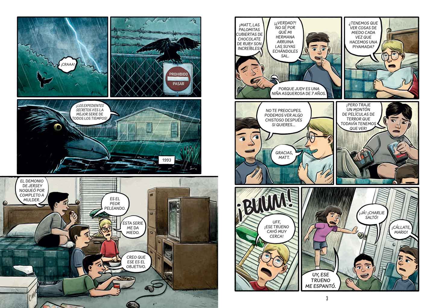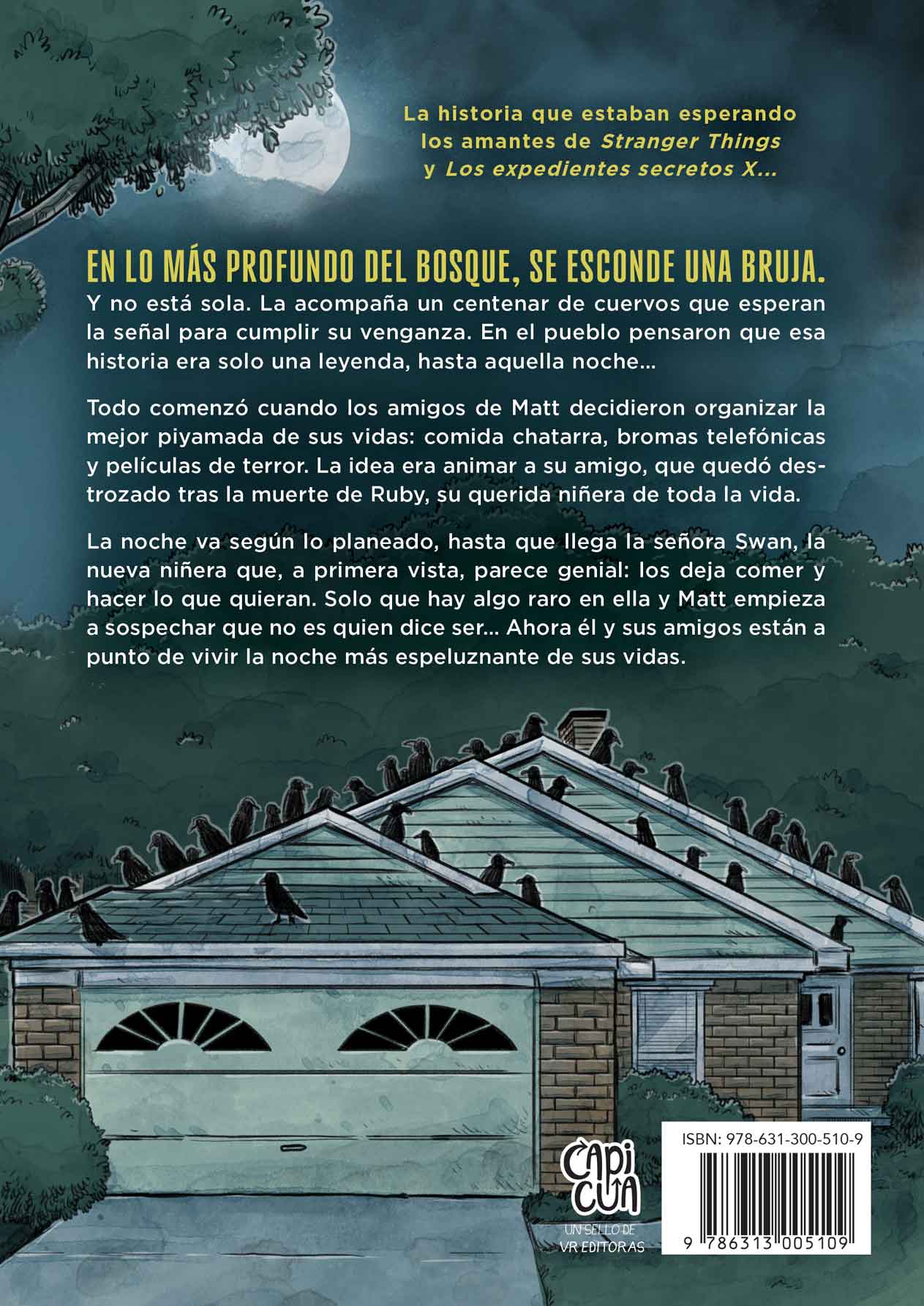 Esta novela gráfica para adolescentes sigue a un grupo de niños que intentan animar a su amigo tras una reciente pérdida con una divertida piyamada, pero sus planes pronto dan un giro oscuro cuando descubren que su nueva niñera, la señora Swan, podría ser, literalmente, un monstruo. Cuando la familia Russo regresa a casa después de las vacaciones y descubre que su niñera, Ruby, ha fallecido inesperadamente, Matthew es quien peor se toma la noticia. Tras semanas de conmoción, sus tres mejores amigos deciden animarlo con una noche de comida chatarra, bromas telefónicas y películas de terror. Pero sus planes para la piyamada se ven comprometidos cuando la madre soltera de Mat, incapaz de tomarse más tiempo libre en el trabajo, se ve obligada a contratar a toda prisa a una nueva niñera para que cuide de Mat y de su hermana pequeña, Judy. Sin embargo, la señora Swan está encantada de tener a los niños en casa. Y aunque parece la niñera perfecta, ya que deja que los niños coman lo que quieran y los deja solos la mayor parte del tiempo, hay algo en ella que no le inspira confianza a Mat. Él cree que en realidad puede ser la bruja de la leyenda local, la que atormenta a los niños por la noche y luego se los come. ¿Es solo que le cuesta aceptar a la sustituta de Ruby, como sospechan sus amigos? ¿Ha visto demasiadas películas de terror, como teme su madre? ¿O él y sus amigos aficionados al terror se enfrentarán al susto de su vida cuando se encuentren cara a cara con un monstruo real?
