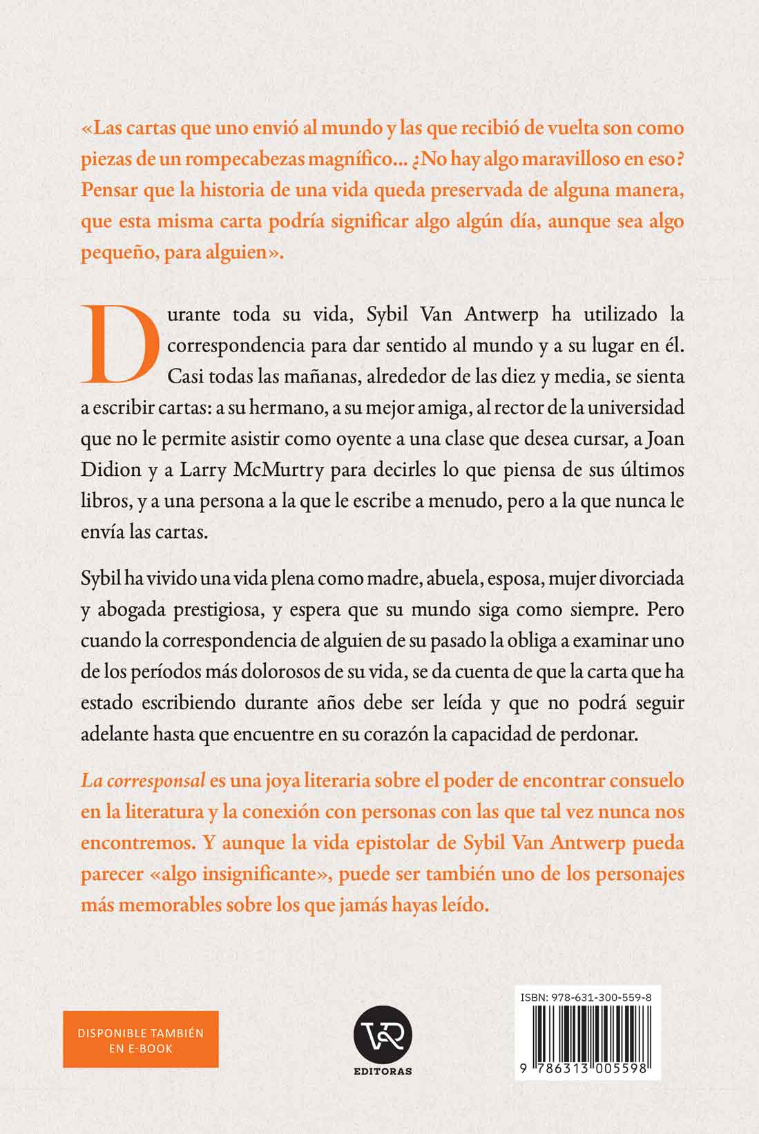 «Imagine: las cartas que uno envió al mundo y las que recibió de vuelta son como piezas de un rompecabezas magnífico... ¿No hay algo maravilloso en eso? Pensar que la historia de una vida queda preservada de alguna manera, que esta misma carta podría significar algo algún día, aunque sea algo pequeño, para alguien». Durante toda su vida, Sybil Van Antwerp ha utilizado la correspondencia para dar sentido al mundo y a su lugar en él. Casi todas las mañanas, alrededor de las diez y media, se sienta a escribir cartas: a su hermano, a su mejor amiga, al rector de la universidad que no le permite asistir como oyente a una clase que desea cursar, a Joan Didion y a Larry McMurtry para decirles lo que piensa de sus últimos libros, y a una persona a la que le escribe a menudo, pero a la que nunca le envía las cartas. Sybil ha vivido una vida plena como madre, abuela, esposa, mujer divorciada y abogada prestigiosa, y espera que su mundo siga como siempre. Pero cuando la correspondencia de alguien de su pasado la obliga a examinar uno de los períodos más dolorosos de su vida, se da cuenta de que la carta que ha estado escribiendo durante años debe ser leída y que no podrá seguir adelante hasta que encuentre en su corazón la capacidad de perdonar. La corresponsal es una joya literaria sobre el poder de encontrar consuelo en la literatura y la conexión con personas con las que tal vez nunca nos encontremos. Y aunque la vida epistolar de Sybil Van Antwerp pueda parecer «algo insignificante», puede ser también uno de los personaje más memorables sobre los que jamás hayas leído.