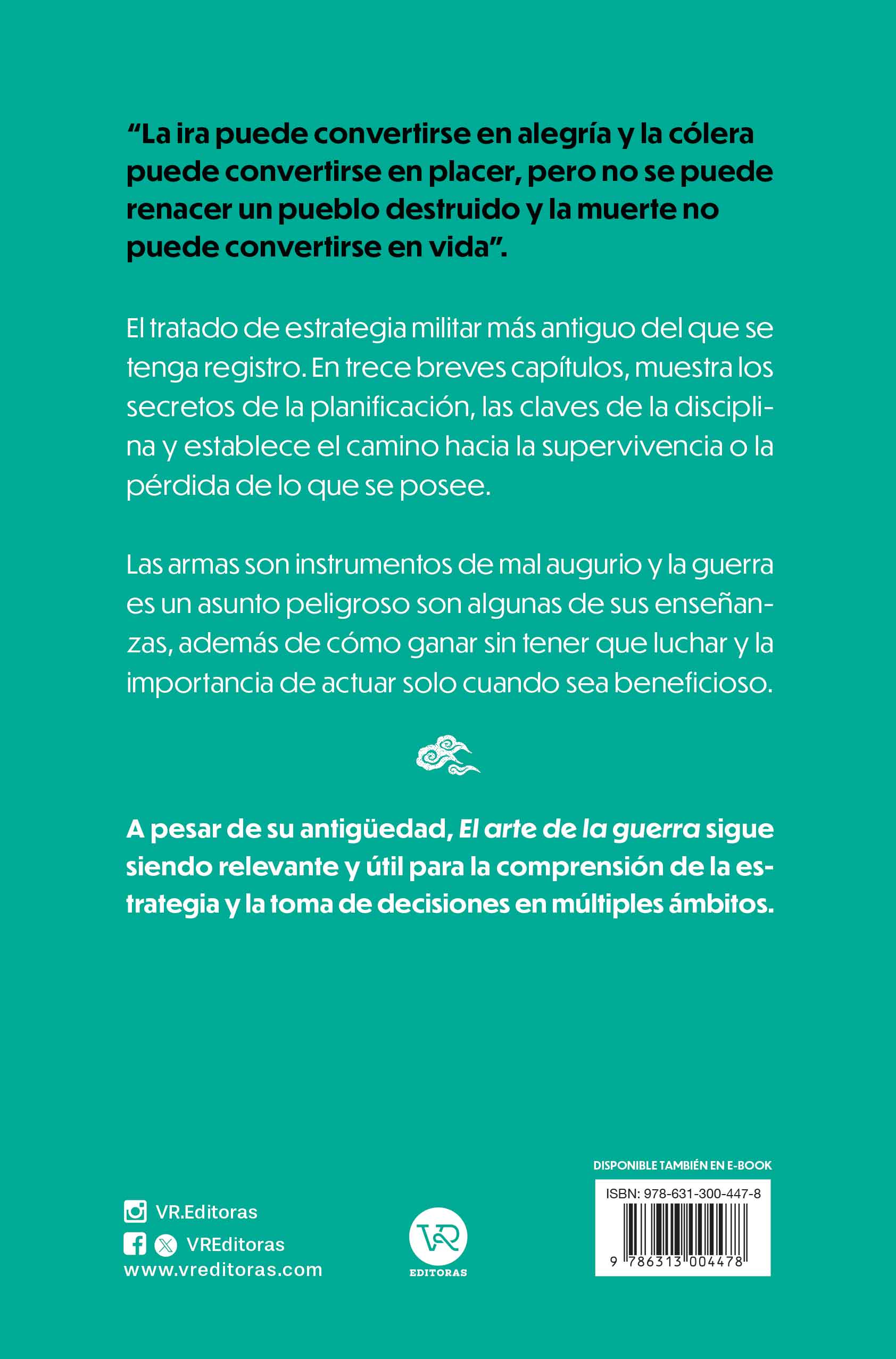 El tratado de estrategia militar más antiguo del que se tenga registro. En trece breves capítulos, muestra los secretos de la planificación, las claves de la disciplina y establece el camino hacia la supervivencia o la pérdida de lo que se posee. Las armas son instrumentos de mal augurio y la guerra es un asunto peligroso son algunas de sus enseñanzas, además de cómo ganar sin tener que luchar y la importancia de actuar solo cuando sea beneficioso.