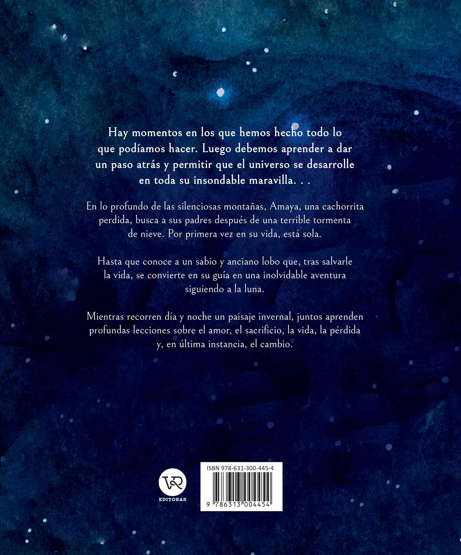 Hay momentos en los que hemos hecho todo lo que podíamos hacer. Luego debemos aprender a dar un paso atrás y permitir que el universo se desarrolle en toda su insondable maravilla. . . En lo profundo de las silenciosas montañas, Amaya, una cachorrita perdida, busca a sus padres después de una terrible tormenta de nieve. Por primera vez en su vida, está sola. Hasta que conoce a un sabio y anciano lobo que, tras salvarle la vida, se convierte en su guía en una inolvidable aventura siguiendo a la luna. Mientras recorren día y noche un paisaje invernal, juntos aprenden profundas lecciones sobre el amor, el sacrificio, la vida, la pérdida y, en última instancia, el cambio.