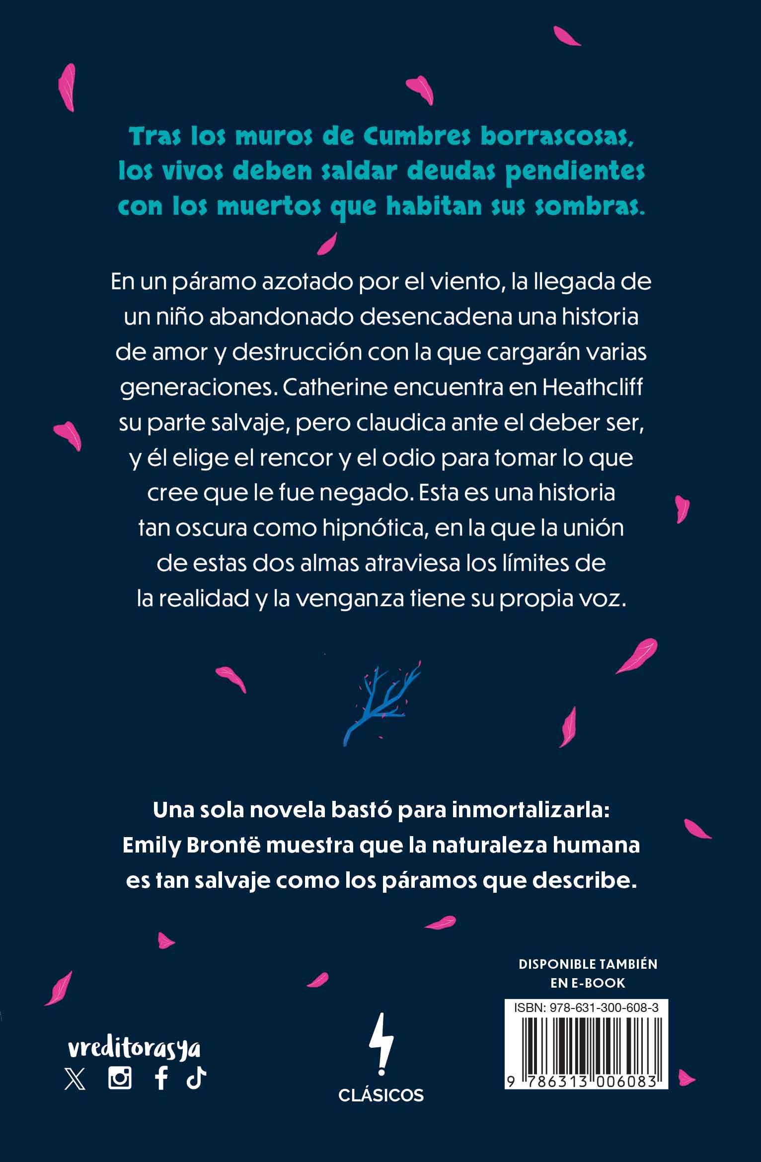 TRAS LOS MUROS DE CUMBRES BORRASCOSAS, LOS VIVOS DEBEN SALDAR DEUDAS PENDIENTES CON LOS MUERTOS QUE HABITAN SUS SOMBRAS. En un páramo azotado por el viento, la llegada de un niño abandonado desencadena una historia de amor y destrucción con la que cargarán varias generaciones. Catherine encuentra en Heathcliff su parte salvaje, pero claudica ante el deber ser, y él elige el rencor y el odio para tomar lo que cree que le fue negado. Esta es una historia tan oscura como hipnótica, en la que la unión de estas dos almas atraviesa los límites de la realidad y la venganza tiene su propia voz. Una sola novela bastó para inmortalizarla: Emily Brontë muestra que la naturaleza humana es tan salvaje como los páramos que describe.