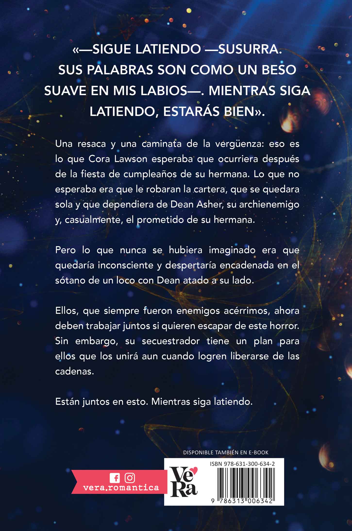 Una resaca y una caminata de la vergüenza: eso es lo que Cora Lawson esperaba que ocurriera después de la fiesta de cumpleaños de su hermana. Lo que no esperaba era que le robaran la cartera, que se quedara sola y que dependiera de Dean Asher, su archienemigo y, casualmente, el prometido de su hermana. Pero lo que nunca se hubiera imaginado era que quedaría inconsciente y despertaría encadenada en el sótano de un loco con Dean atado a su lado. Ellos, que siempre fueron enemigos acérrimos, ahora deben trabajar juntos si quieren escapar de este horror. Sin embargo, su secuestrador tiene un plan para ellos que los unirá aun cuando logren liberarse de las cadenas. Están juntos en esto. Mientras siga latiendo.