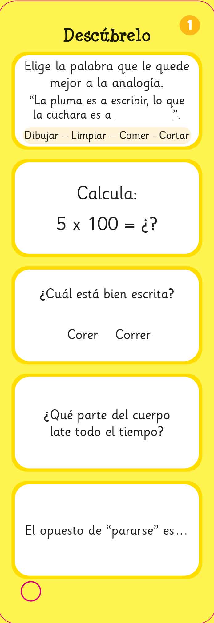 Actividades para entrenar al cerebro. Las niñas y los niños despertarán su curiosidad y la chispa del conocimiento a través de ejercicios didácticos adaptados a su edad. Cada tarjeta tiene lindas ilustraciones y las soluciones al reverso. Y lo mejor de todo: ¡ juegos y actividades para divertirse!