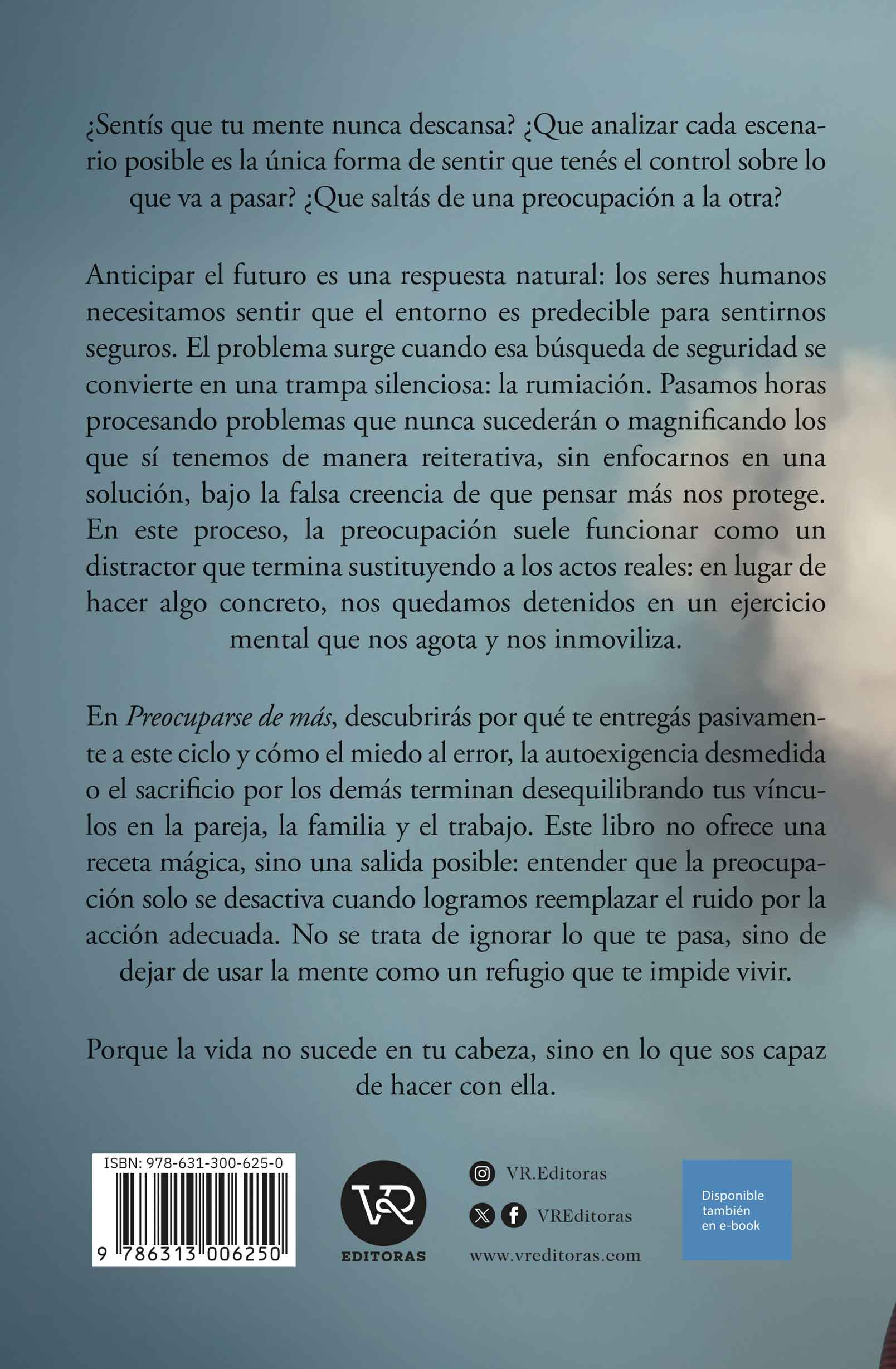 ¿Sentís que tu mente nunca descansa? ¿Que analizar cada escenario posible es la única forma de sentir que tenés el control sobre lo que va a pasar? ¿Que saltás de una preocupación a la otra? Anticipar el futuro es una respuesta natural: los seres humanos necesitamos sentir que el entorno es predecible para sentirnos seguros. El problema surge cuando esa búsqueda de seguridad se convierte en una trampa silenciosa: la rumiación. Pasamos horas procesando problemas que nunca sucederán o magnicando los que sí tenemos de manera reiterativa, sin enfocarnos en una solución, bajo la falsa creencia de que pensar más nos protege. En este proceso, la preocupación suele funcionar como un distractor que termina sustituyendo a los actos reales: en lugar de hacer algo concreto, nos quedamos detenidos en un ejercicio mental que nos agota y nos inmoviliza. En Preocuparse de más, descubrirás por qué te entregás pasivamente a este ciclo y cómo el miedo al error, la autoexigencia desmedida o el sacrificio por los demás terminan desequilibrando tus vínculos en la pareja, la familia y el trabajo. Este libro no ofrece una receta mágica, sino una salida posible: entender que la preocupación solo se desactiva cuando logramos reemplazar el ruido por la acción adecuada. No se trata de ignorar lo que te pasa, sino de dejar de usar la mente como un refugio que te impide vivir. Porque la vida no sucede en tu cabeza, sino en lo que sos capaz de hacer con ella.