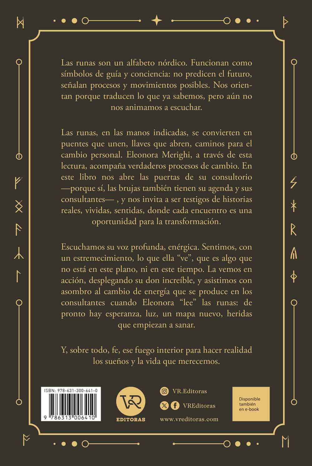 Las runas son un alfabeto nórdico. Funcionan como símbolos de guía y conciencia: no predicen el futuro, señalan procesos y movimientos posibles. Nos orientan porque traducen lo que ya sabemos, pero aún no nos animamos a escuchar. Las runas, en las manos indicadas, se convierten en puentes que unen, llaves que abren, caminos para el cambio personal. Eleonora Merighi, a través de esta lectura, acompaña verdaderos procesos de cambio. En este libro nos abre las puertas de su consultorio —porque sí, las brujas también tienen su agenda y sus consultantes—, y nos invita a ser testigos de historias reales, vividas, sentidas, donde cada encuentro es una oportunidad para la transformación. Escuchamos su voz profunda, enérgica. Sentimos, con un estremecimiento, lo que ella “ve”, que es algo que no está en este plano, ni en este tiempo. La vemos en acción, desplegando su don increíble, y asistimos con asombro al cambio de energía que se produce en los consultantes cuando Eleonora “lee” las runas: de pronto hay esperanza, luz, un mapa nuevo, heridas que empiezan a sanar. Y, sobre todo, fe, ese fuego interior para hacer realidad los sueños y la vida que merecemos.