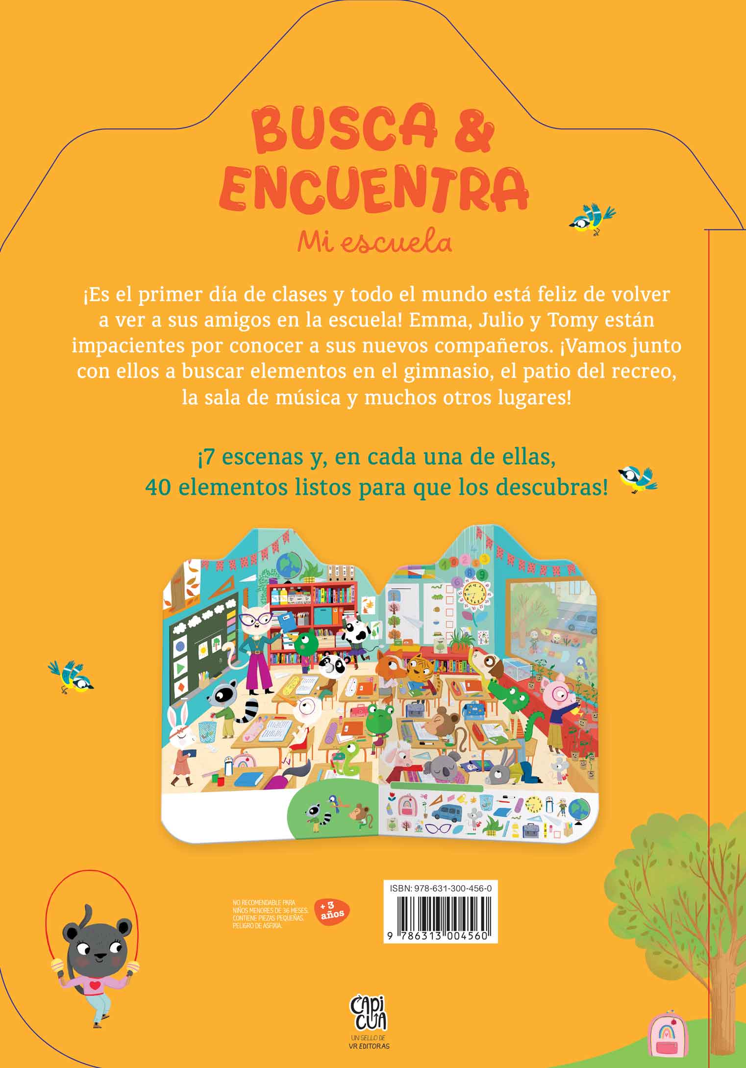 El regreso a clases es mucho más divertido con estas escenas llenas de detalles que los lectores irán descubriendo en sucesivas lecturas, porque este libro no se agota en una sola. ¿Es hora de preparar la mochila para reunirse con los amigos? Acompañá la emocionante experiencia con Emma, Julio y Tommy. Desde el aula hasta el recreo, pasando por el comedor o la sala de música, descubre un día en la escuela más divertida del mundo!