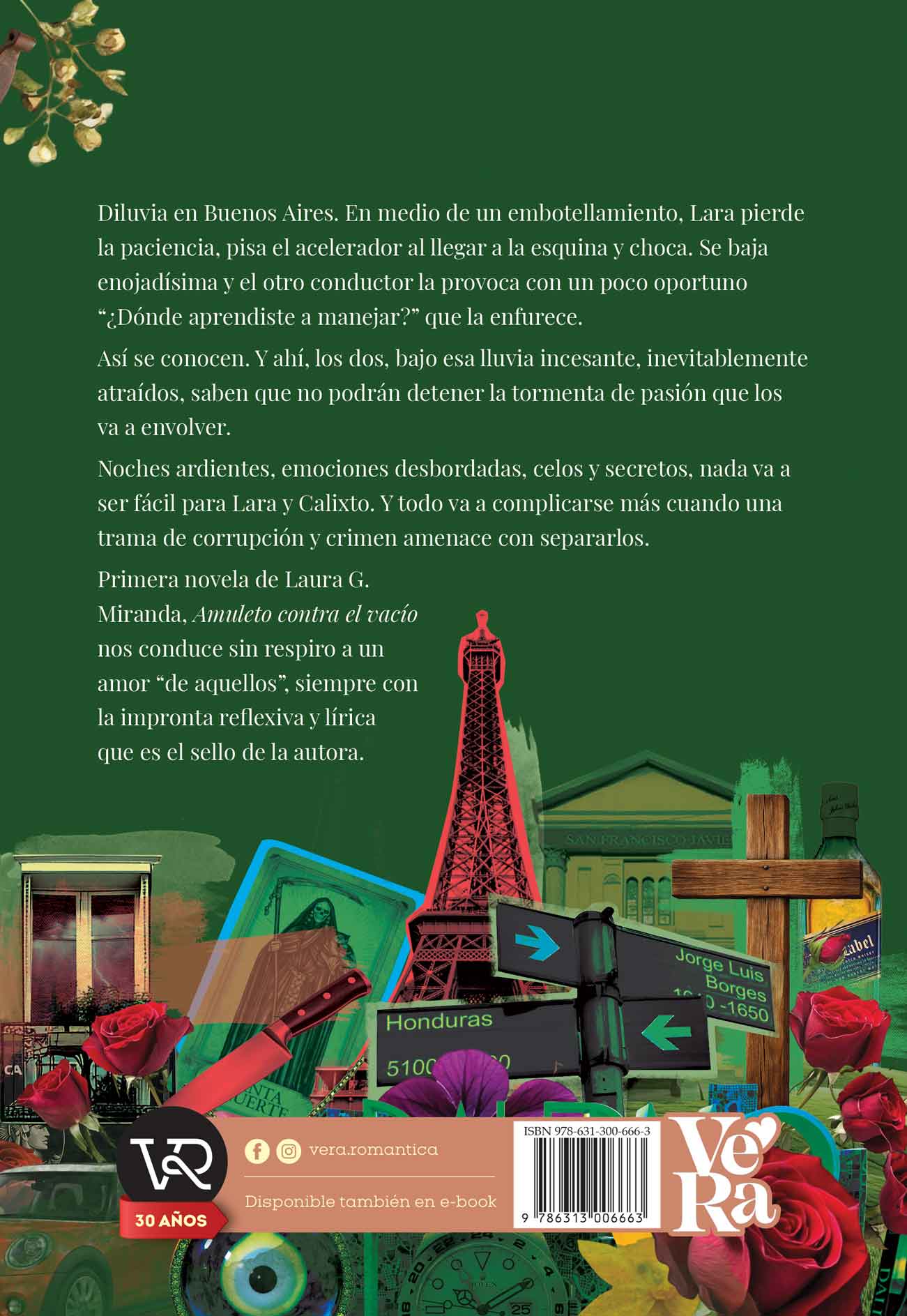 Diluvia en Buenos Aires. En medio de un embotellamiento, Lara pierde la paciencia, pisa el acelerador al llegar a la esquina y choca. Se baja enojadísima y el otro conductor la provoca con un poco oportuno “¿Dónde aprendiste a manejar?” que la enfurece. Así se conocen. Y ahí, los dos, bajo esa lluvia incesante, inevitablemente atraídos, saben que no podrán detener la tormenta de pasión que los va a envolver. Noches ardientes, emociones desbordadas, celos y secretos, nada va a ser fácil para Lara y Calixto. Y todo va a complicarse más cuando una trama de corrupción y crimen amenace con separarlos. Primera novela de Laura G. Miranda, Amuleto contra el vacío nos conduce sin respiro a un amor “de aquellos”, siempre con la impronta reflexiva y lírica que es el sello de la autora.